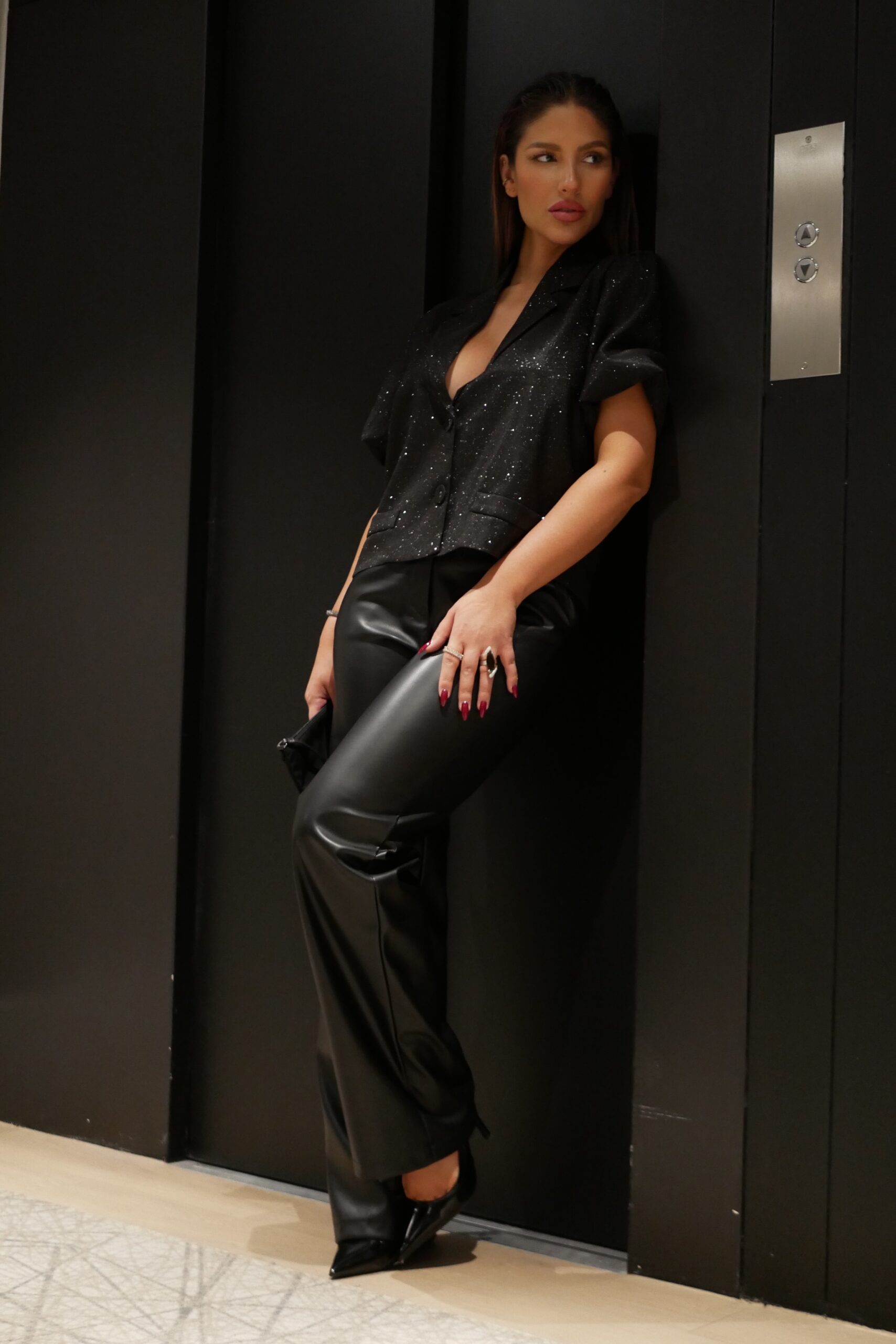 Blazer noir entièrement pailleté mais de façon subtile, offrant un rendu élégant sans être trop voyant. Les manches trois-quarts bouffantes apportent une structure et un beau volume à la silhouette.