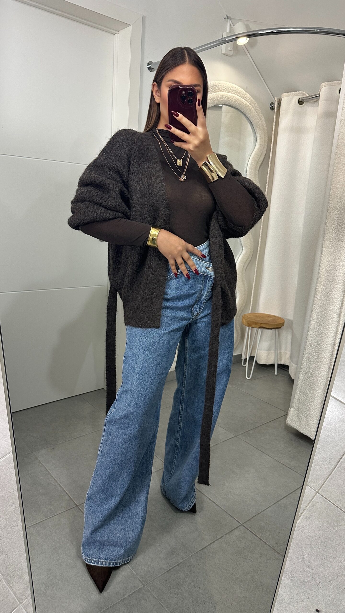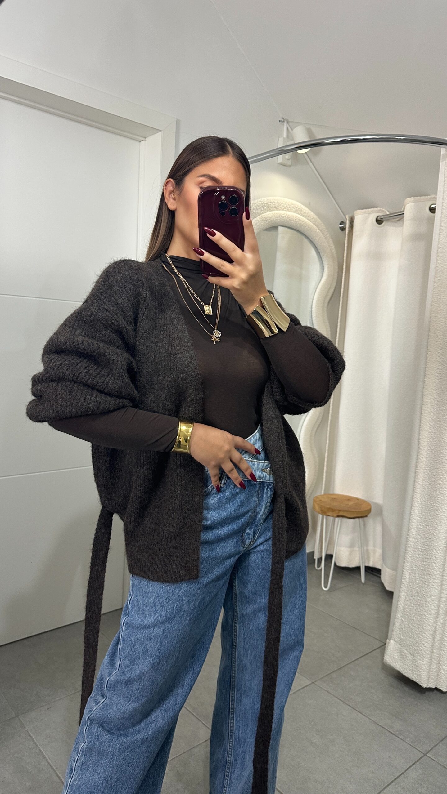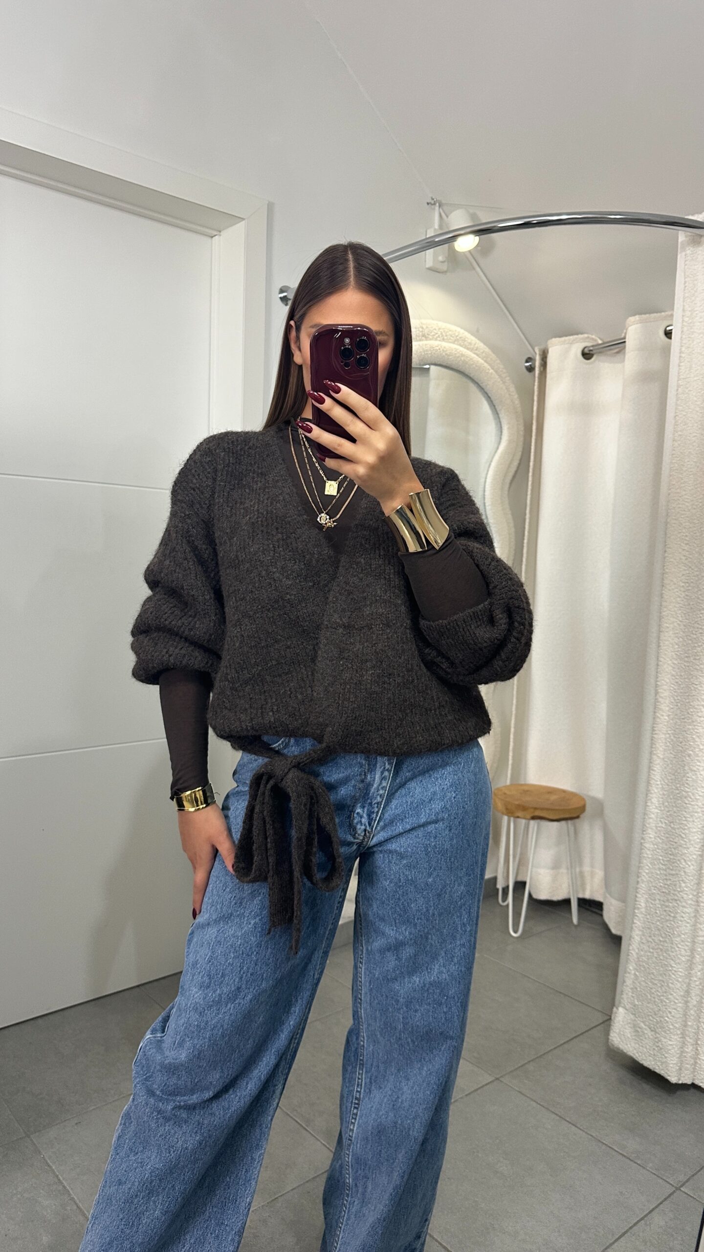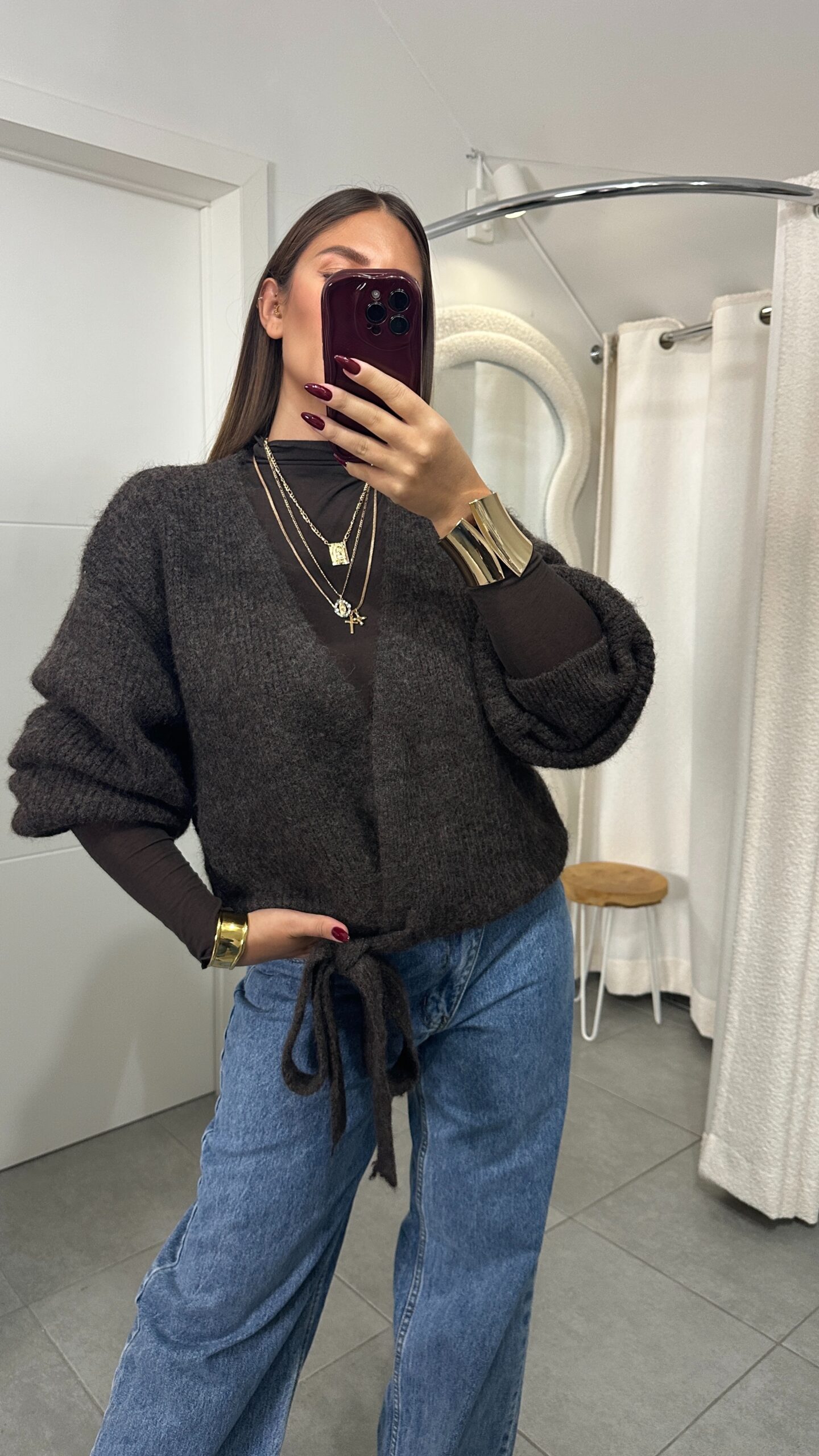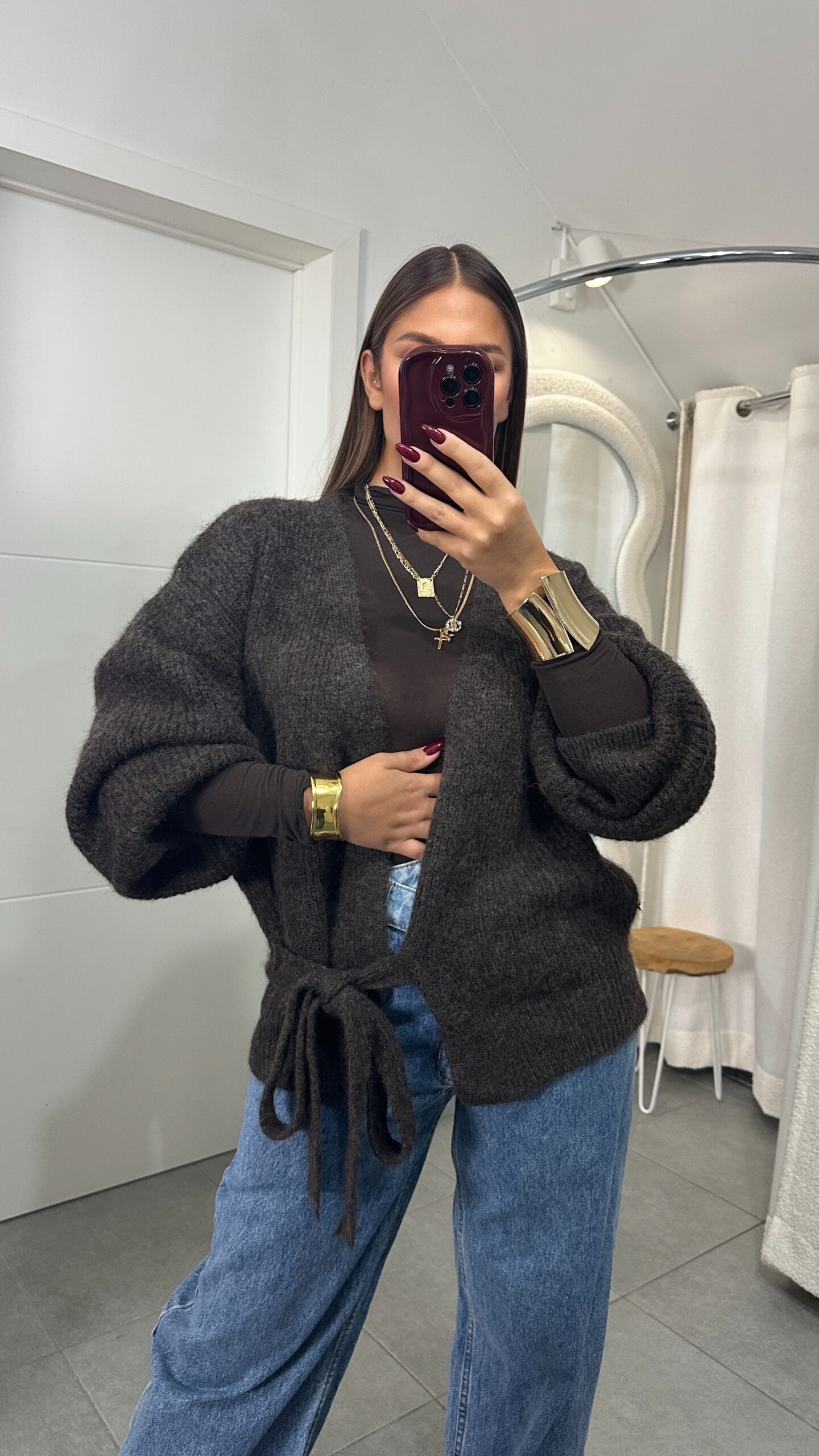 Manches ballon, nœud à nouer à l’avant légèrement sur le côté. Peut se porter de plusieurs façons : extérieur, rentré, un côté dedans et l’autre dehors, ouvert ou fermé. Il tient bien chaud et reste chic à la fois.