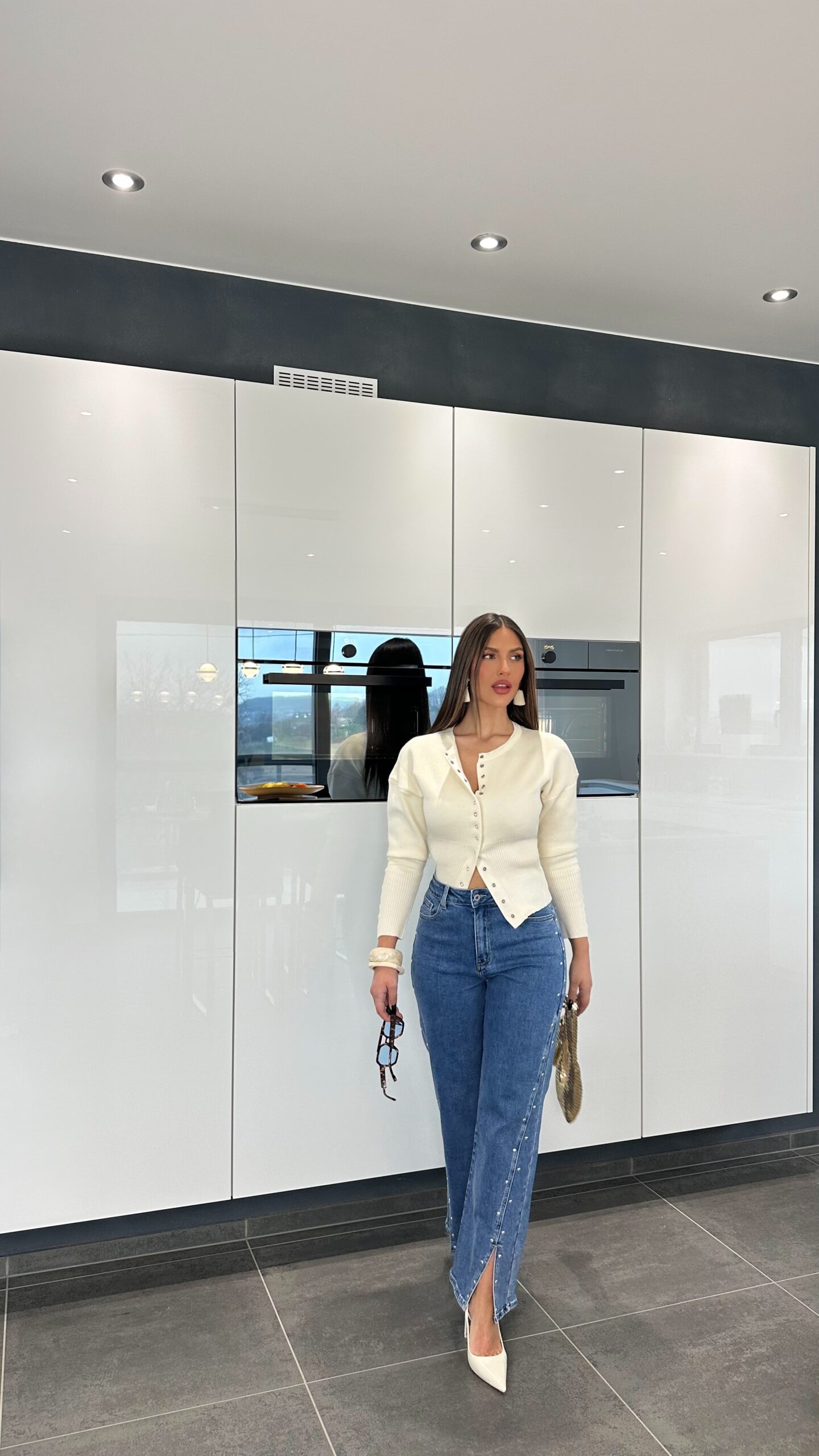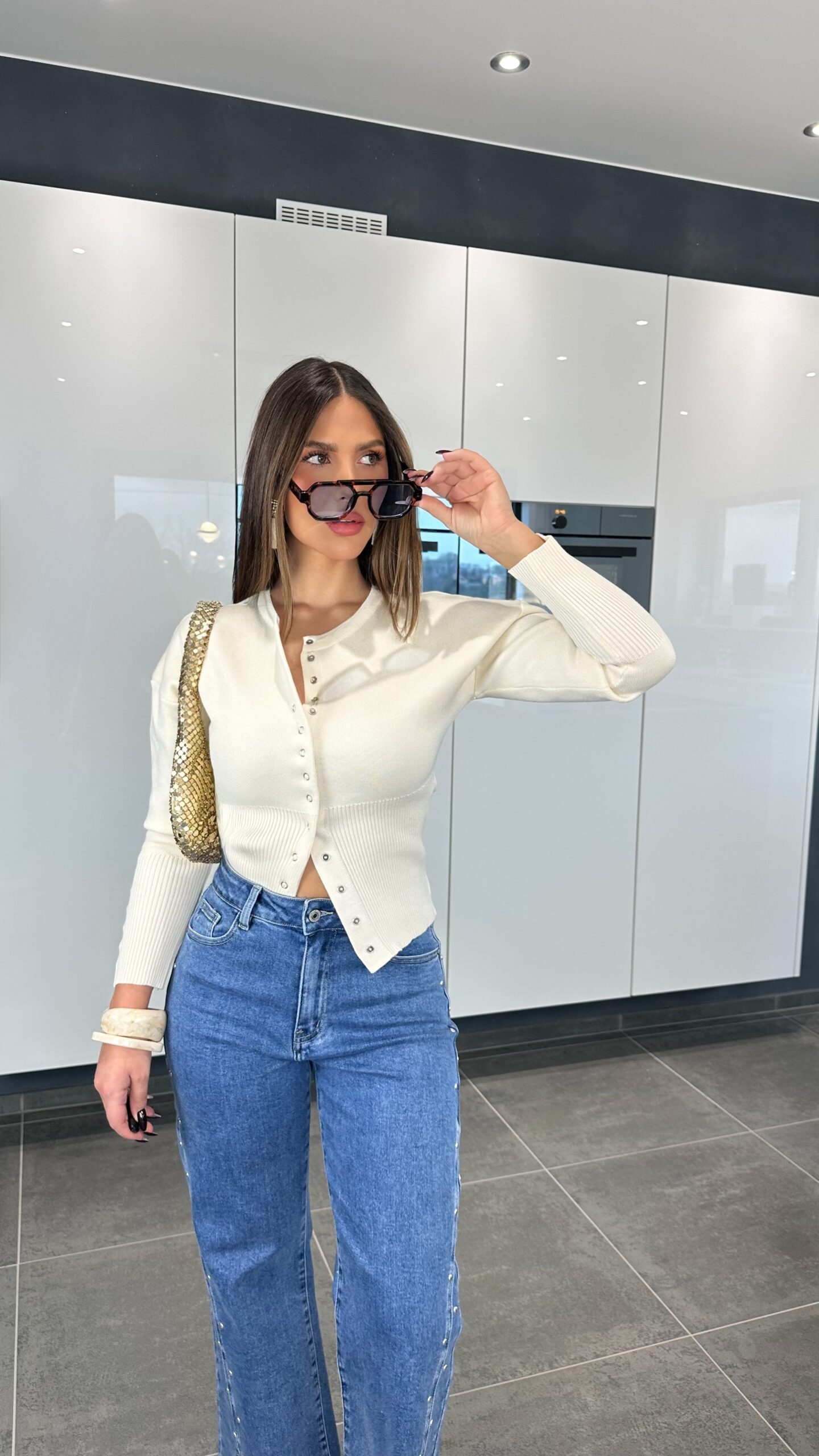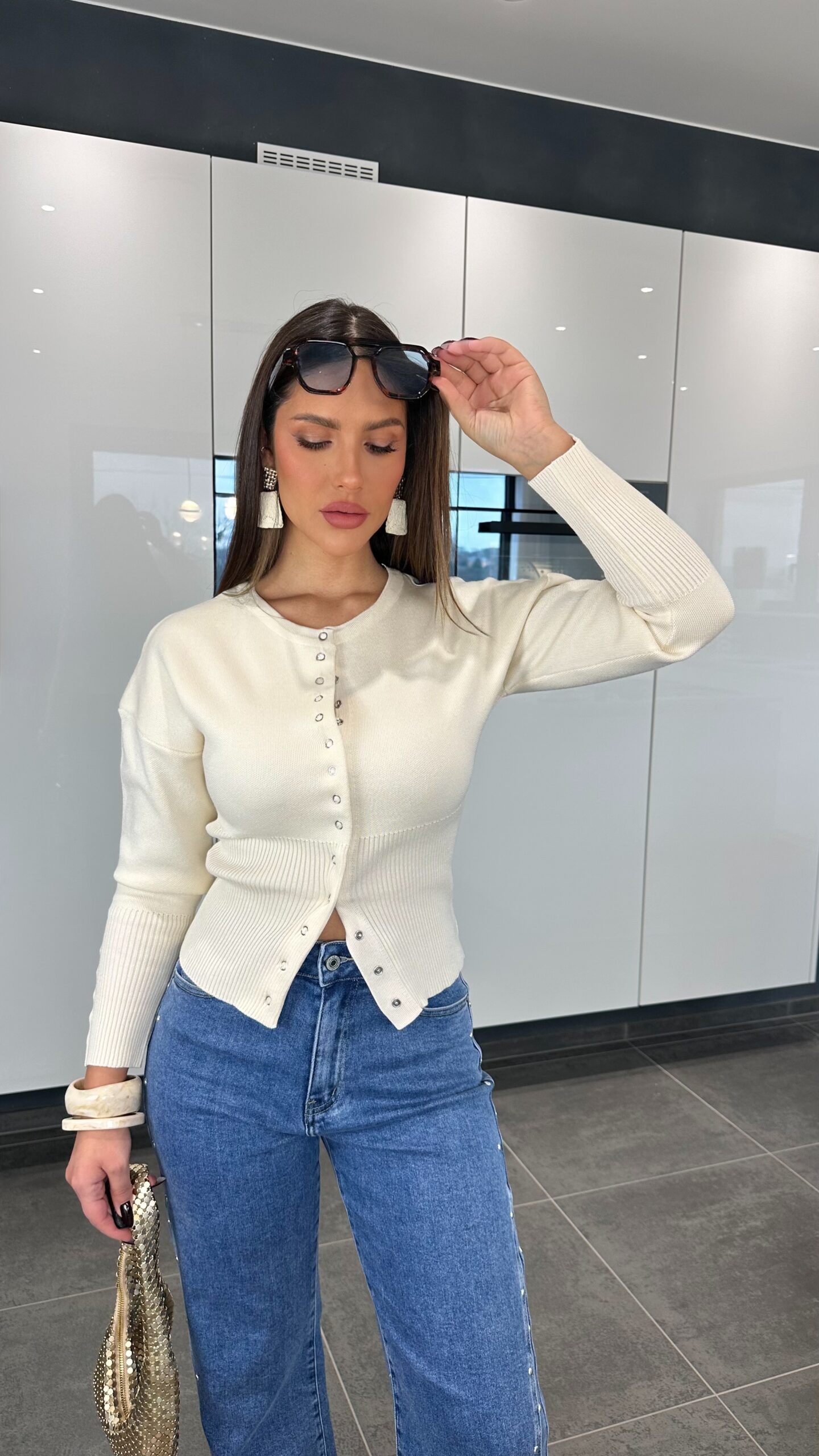 À porter ouvert ou fermé, encore plus d’effet fermé. Manches serrantes au niveau de l’avant bras, très élégant mais peut aussi faire sportwear. Vous pouvez jouer avec les boutons, laisser attachés quelque uns. Se porte avec jupe, pantalon ou même jean. Les boutons argentés apportent un détail super joli.