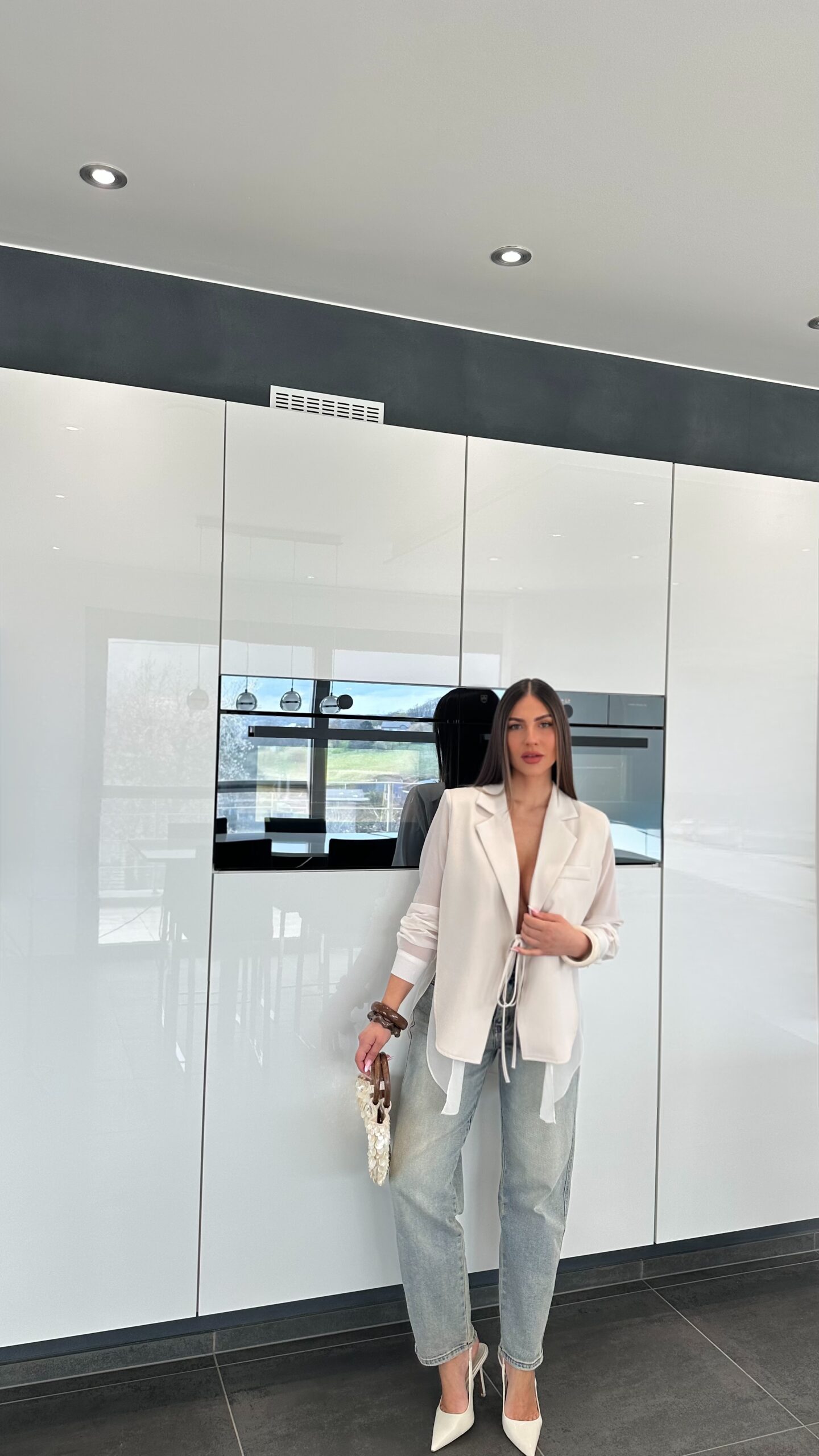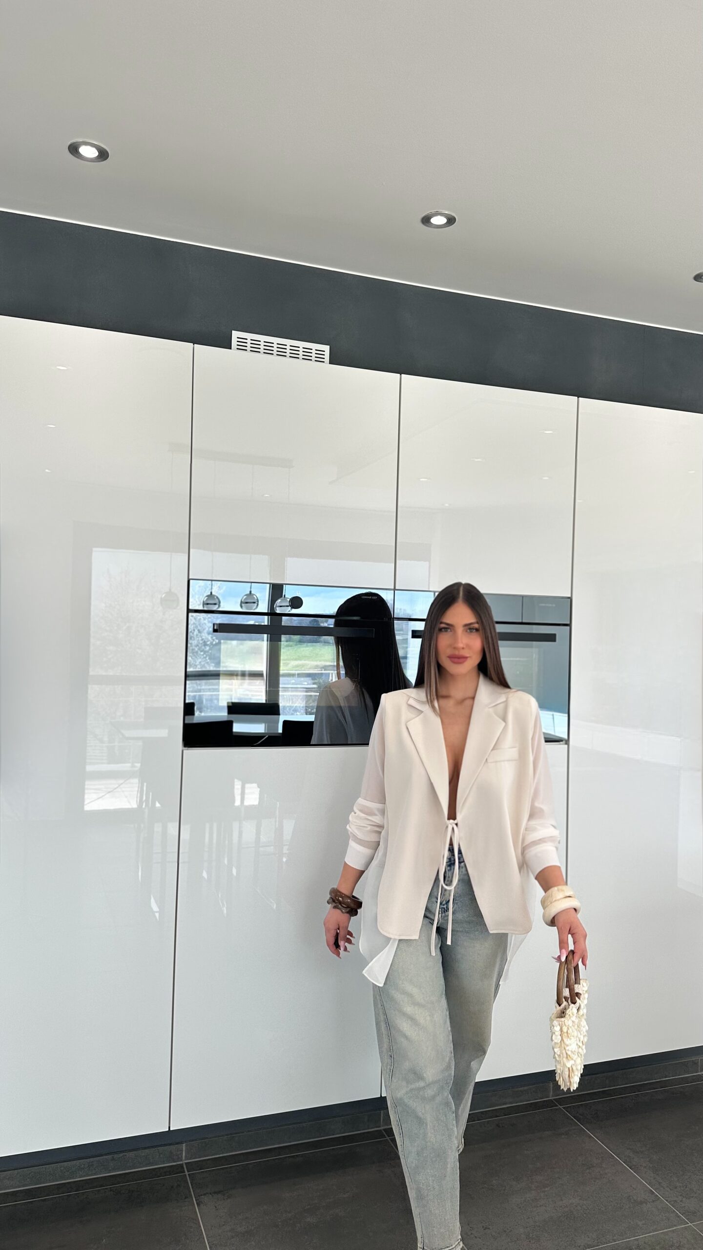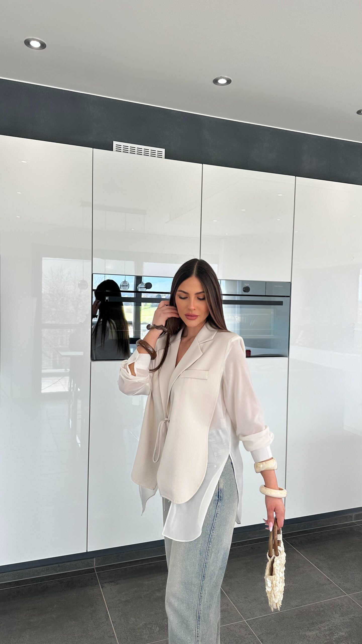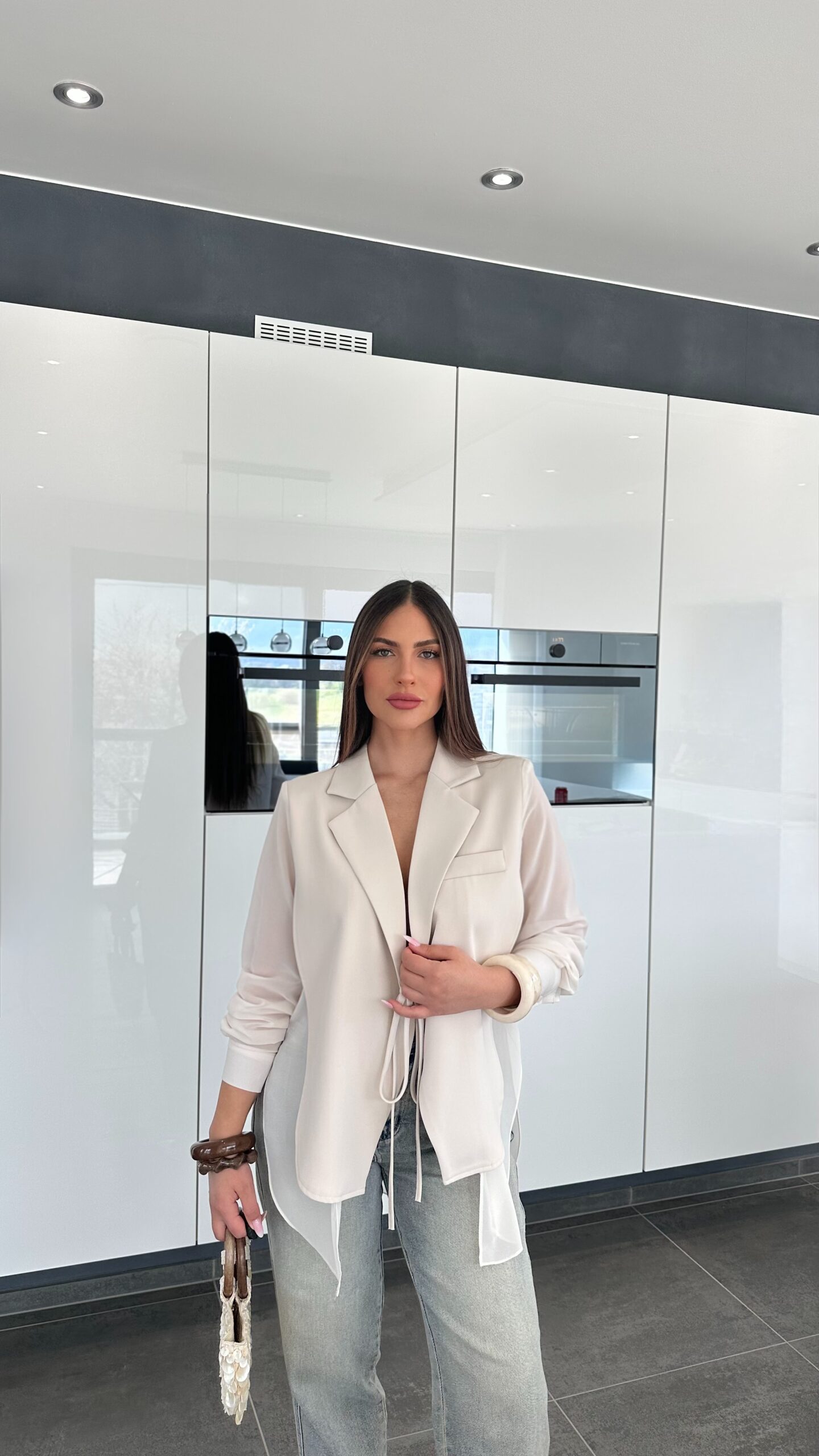 Haut hybride entre chemisier et blazer, très polyvalent. À l’avant, une coupe blazer structurée et formelle, avec une matière fine, légère et raffinée. Le détail qui change tout, ses manches et son dos en voile, juste splendides, qui apportent une vraie touche d’originalité et de féminité.