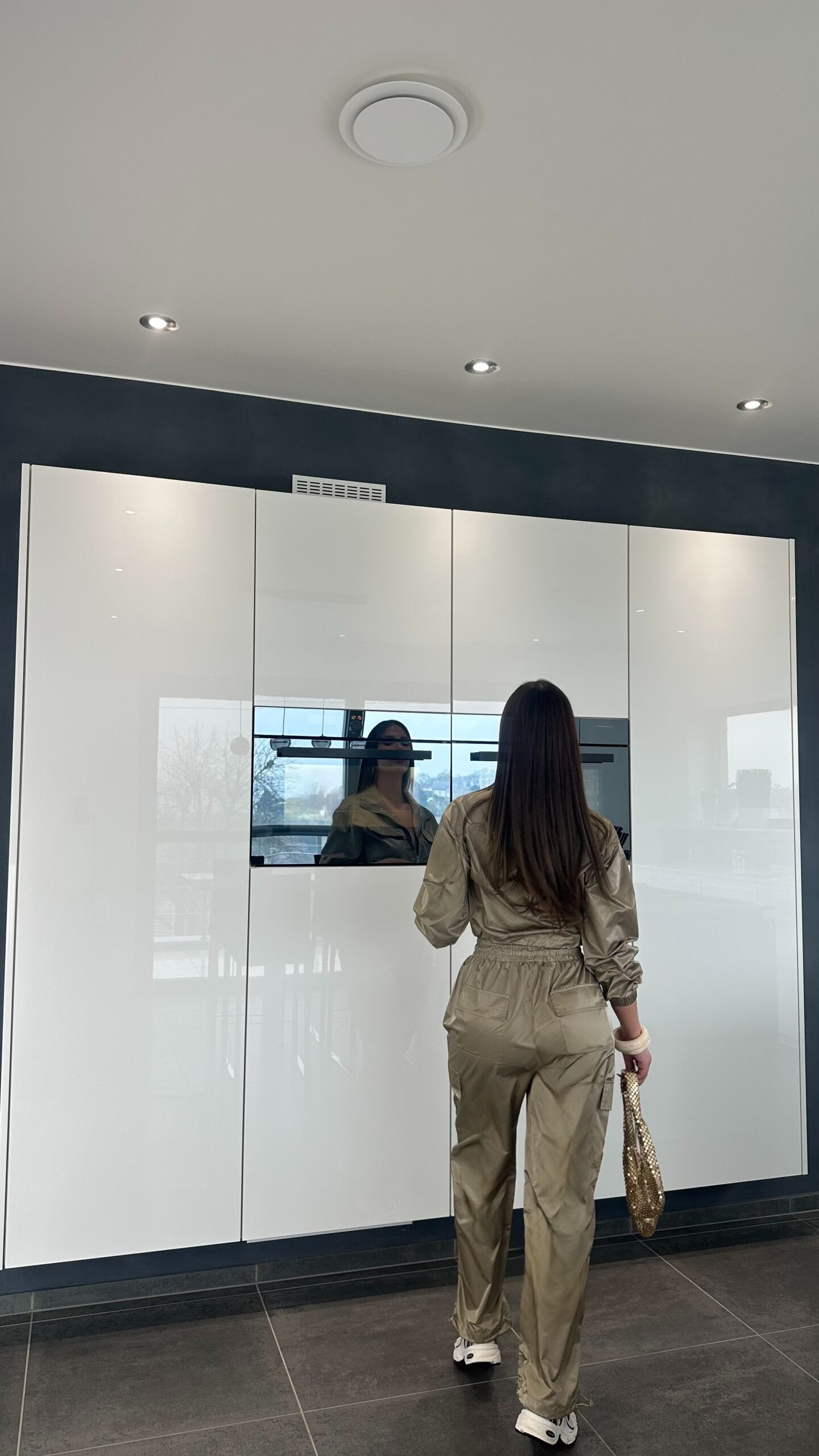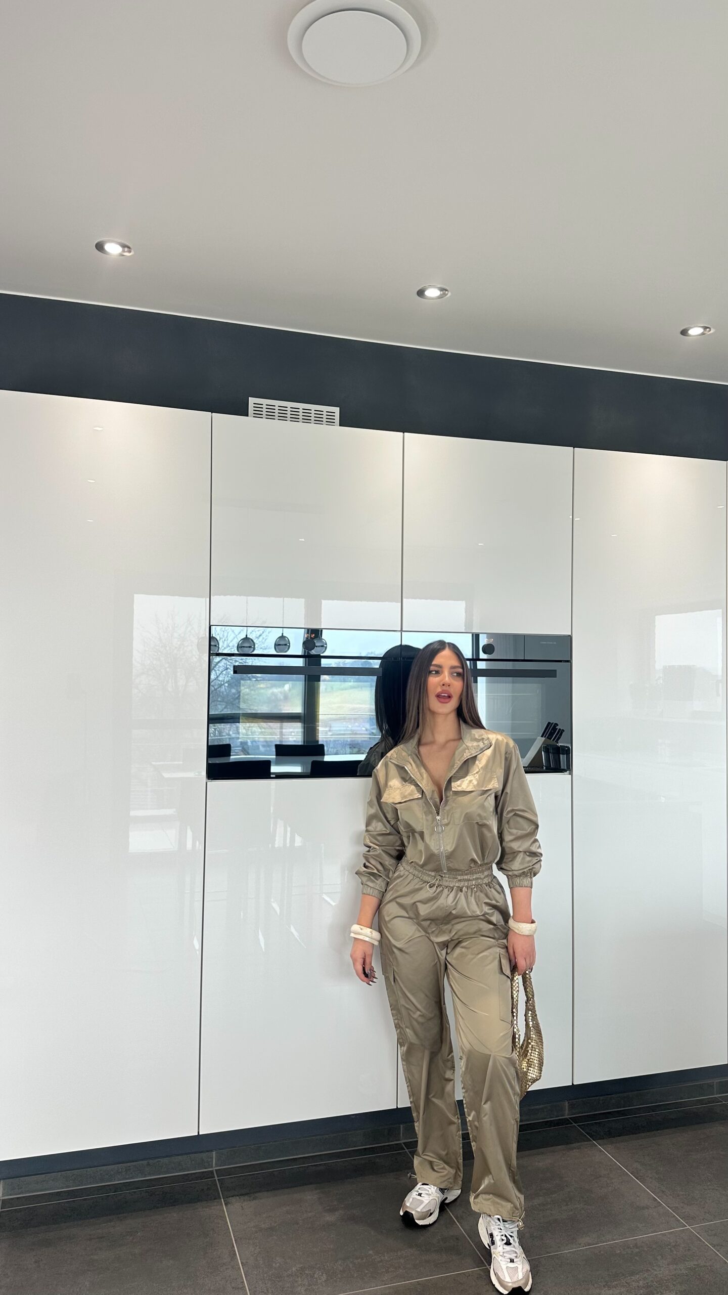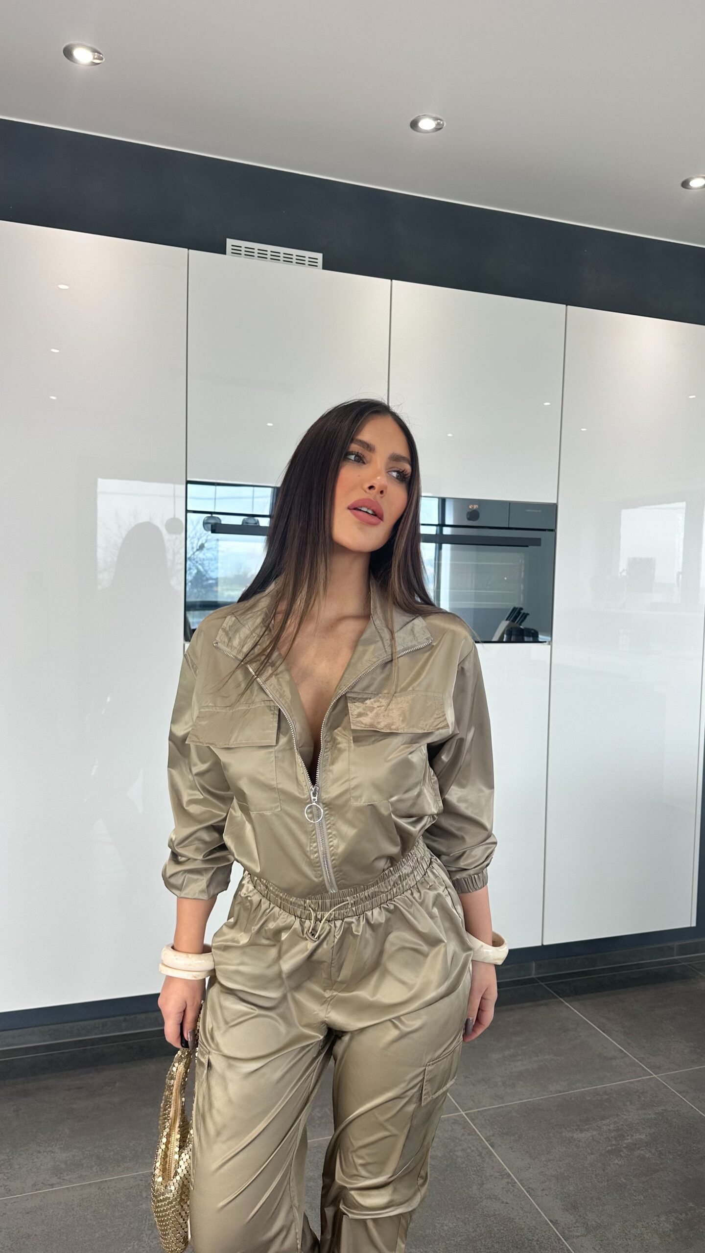 Ensemble deux pièces kaki clair avec élastique au style moderne et tendance. Veste zippée avec col et poches à l’avant qui apporte une touche sport chic. Pantalon assorti à taille élastiquée pour un confort optimal et une silhouette fluide. Matière satinée légère qui donne un effet élégant tout en restant décontracté.