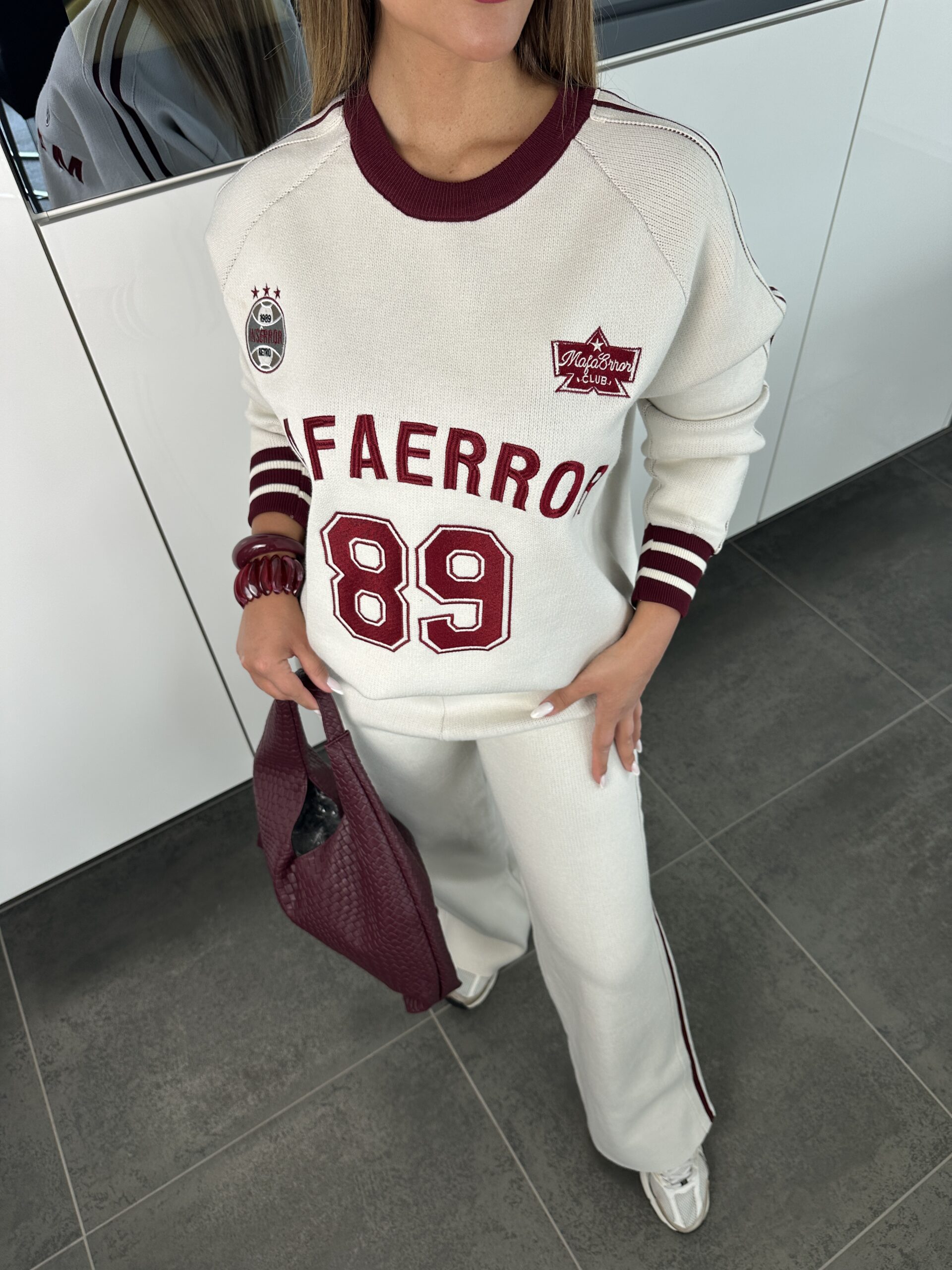 Ensemble pantalon et pull manches longues style New York, avec bandes bordeaux sur le côté et motifs chiffres/écriture à l’avant. Comfy & élégant, parfait pour un look décontracté mais stylé au quotidien.