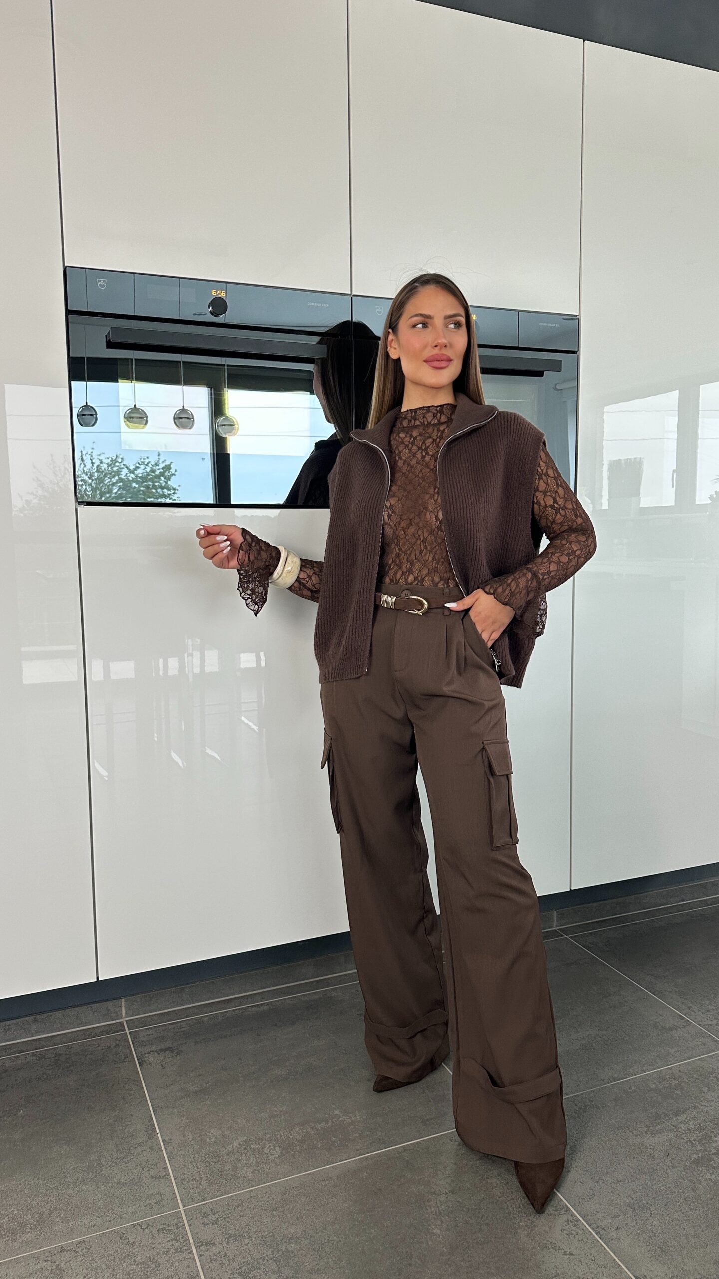 Gilet marron à zip mi-long, à porter attaché ou détaché pour un style bomber ou décontracté. Idéal avec une blouse en dentelle ou toute autre blouse pour un look chic et moderne.
