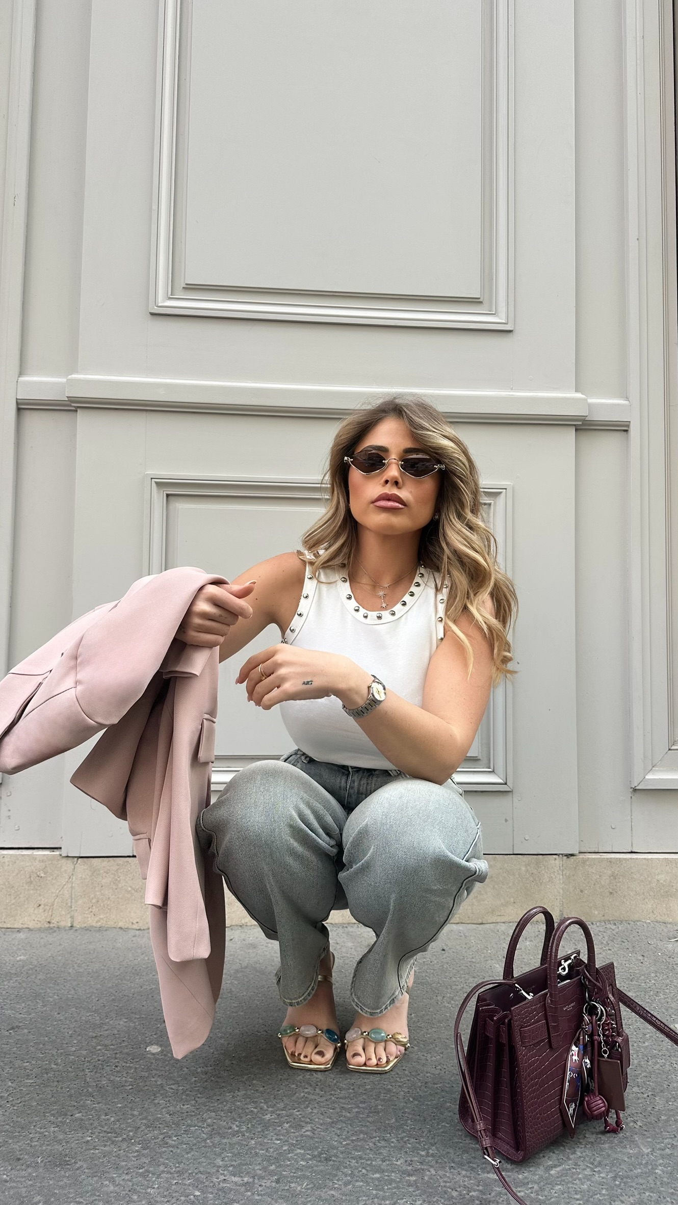 Débardeur blanc, simple et de très bonne qualité, mais avec une vraie particularité : ses gros clous tout autour de l’encolure qui apportent directement une touche stylée et sophistiquée.