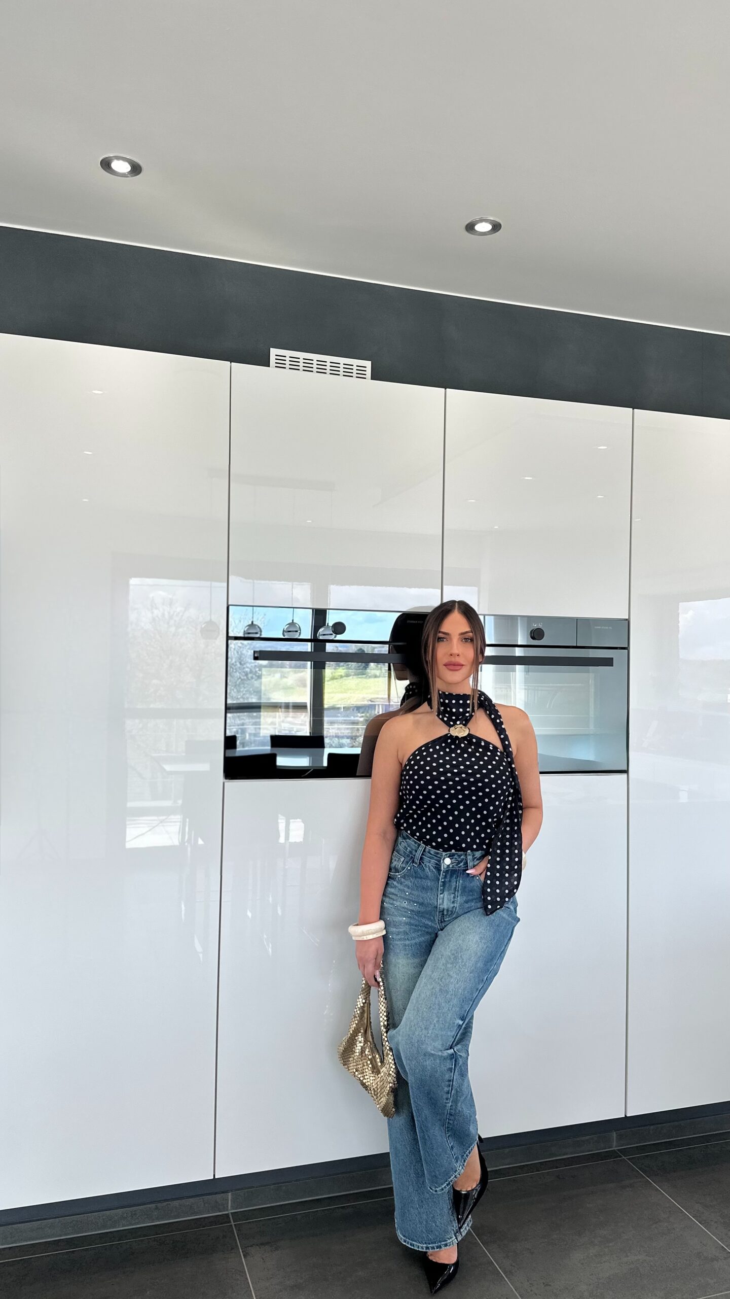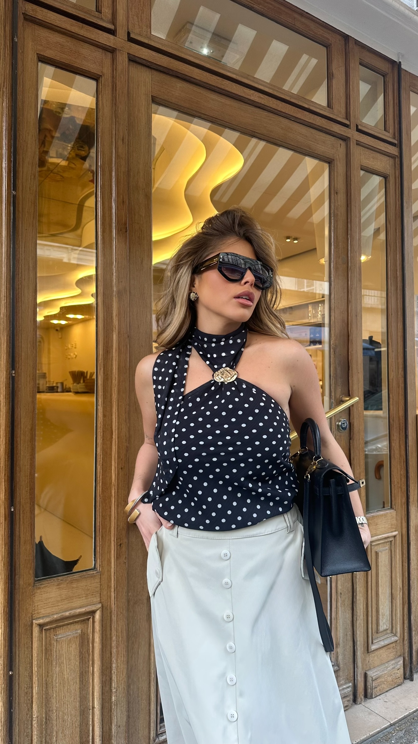Imprimé pois intemporel qui revient toujours à la mode sans jamais se démoder. Une pièce très classe qui élève instantanément une tenue. Détail bijou doré à l’avant qui apporte une touche élégante et sophistiquée.