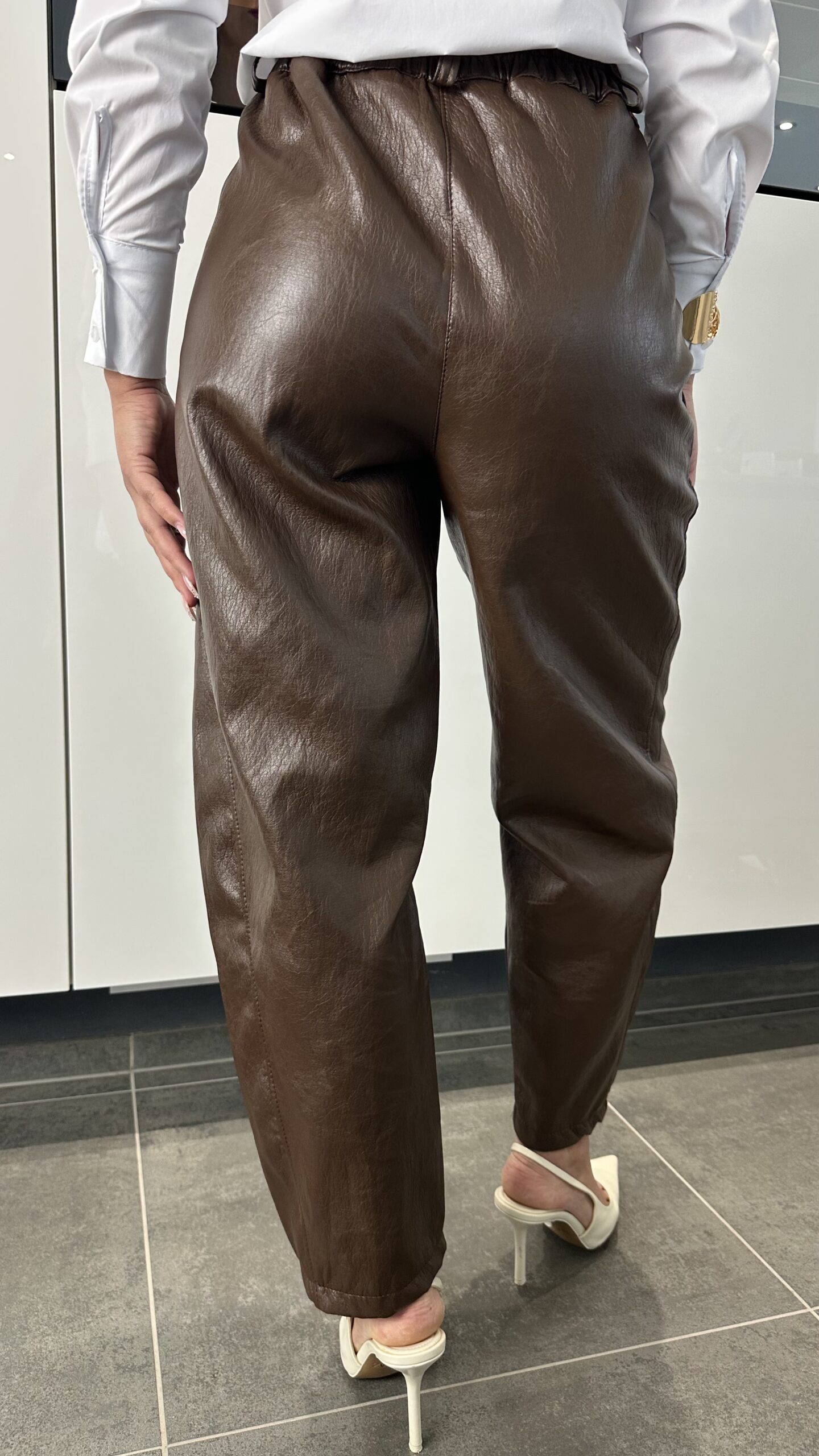 PANTALON SIMILI CUIR – MARRON COUPE BARREL BALLON