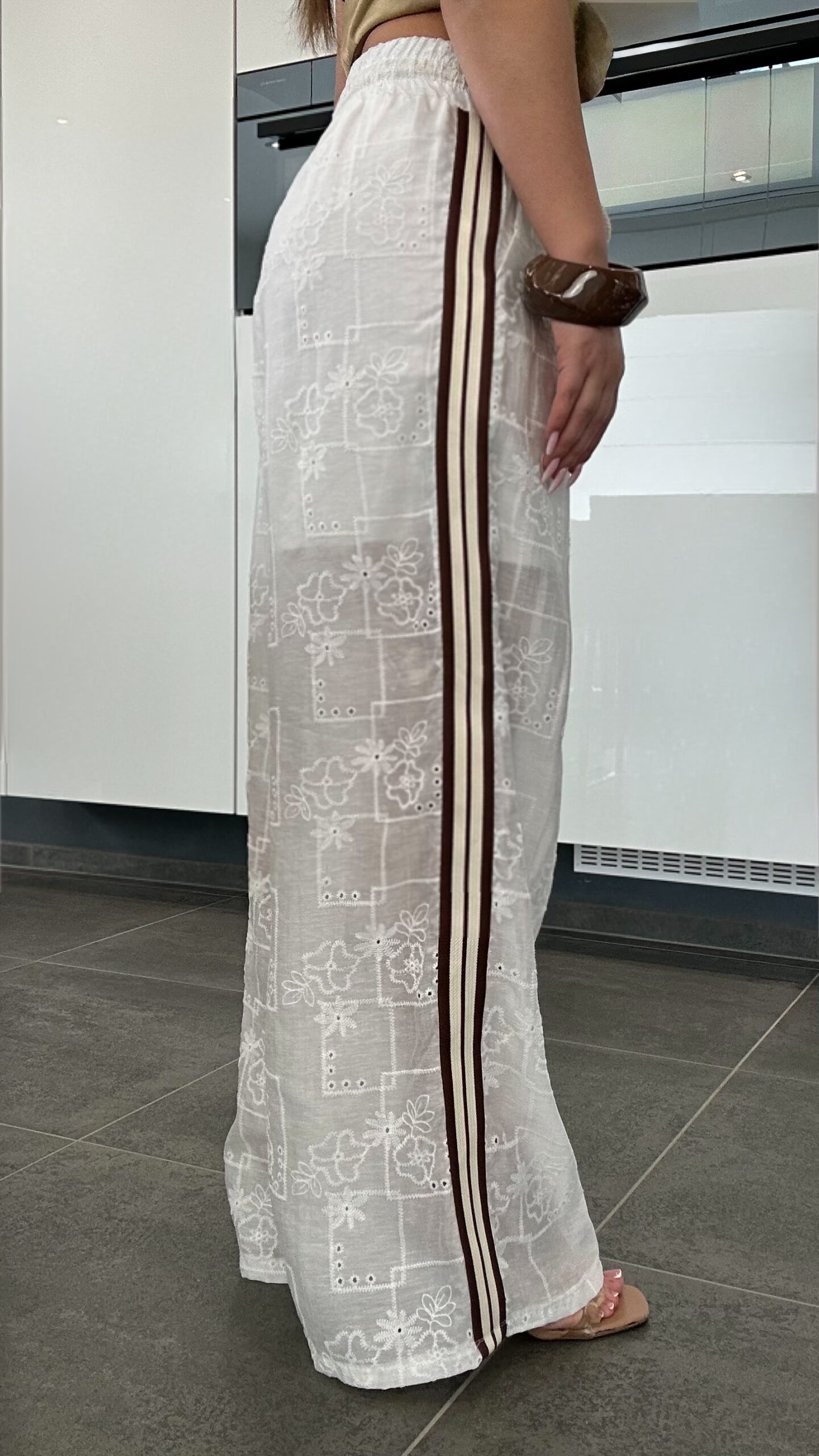 Pantalon brodé blanc cassé avec élastique tout autour de la taille, taille unique pour un confort parfait. Entièrement doublé, il n’est absolument pas transparent. Une pièce au style bohème chic avec une touche plus moderne grâce aux trois bandes sur le côté marron et beige qui cassent le côté classique.