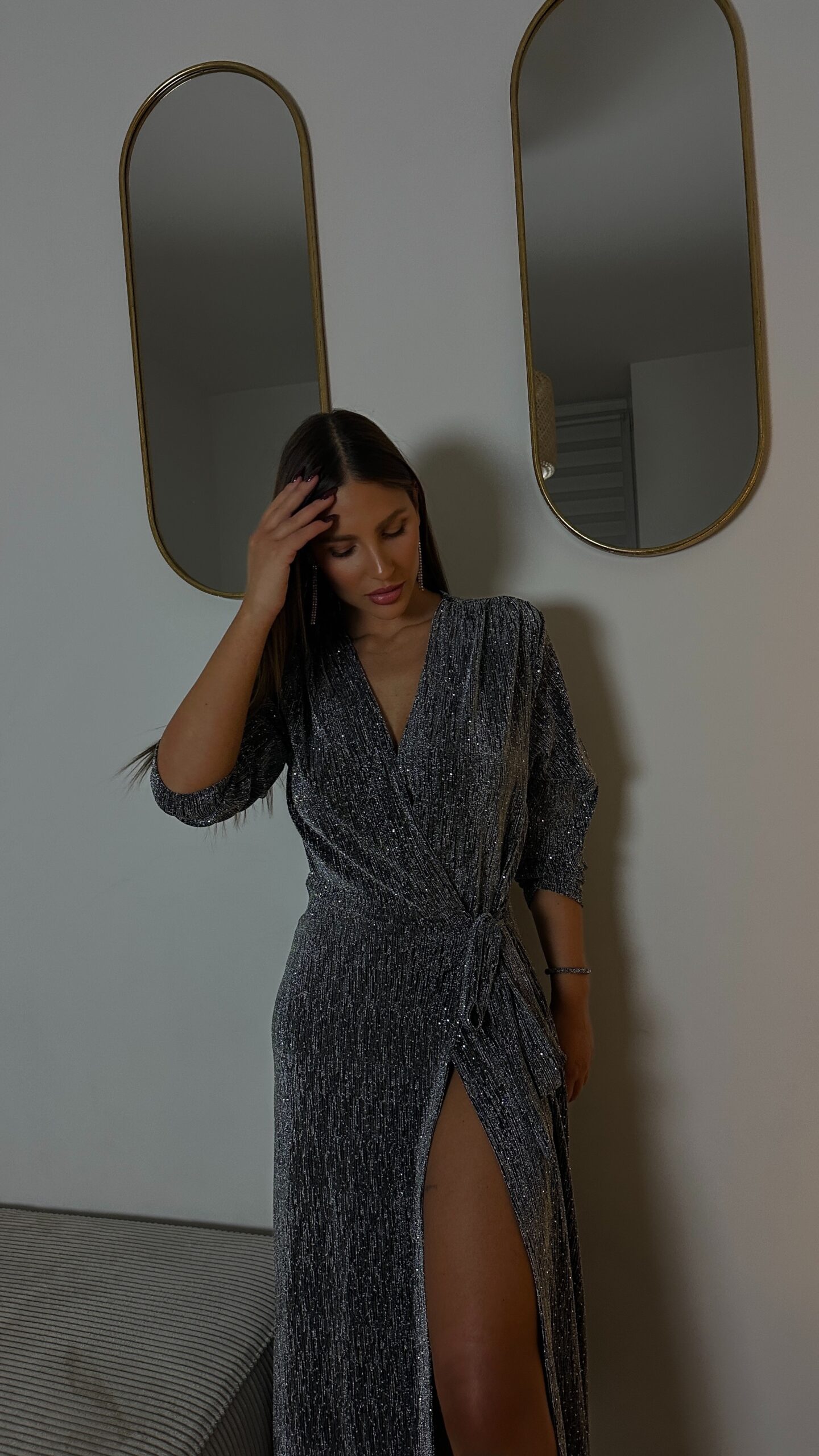 Une robe longue argentée, scintillante et élégante