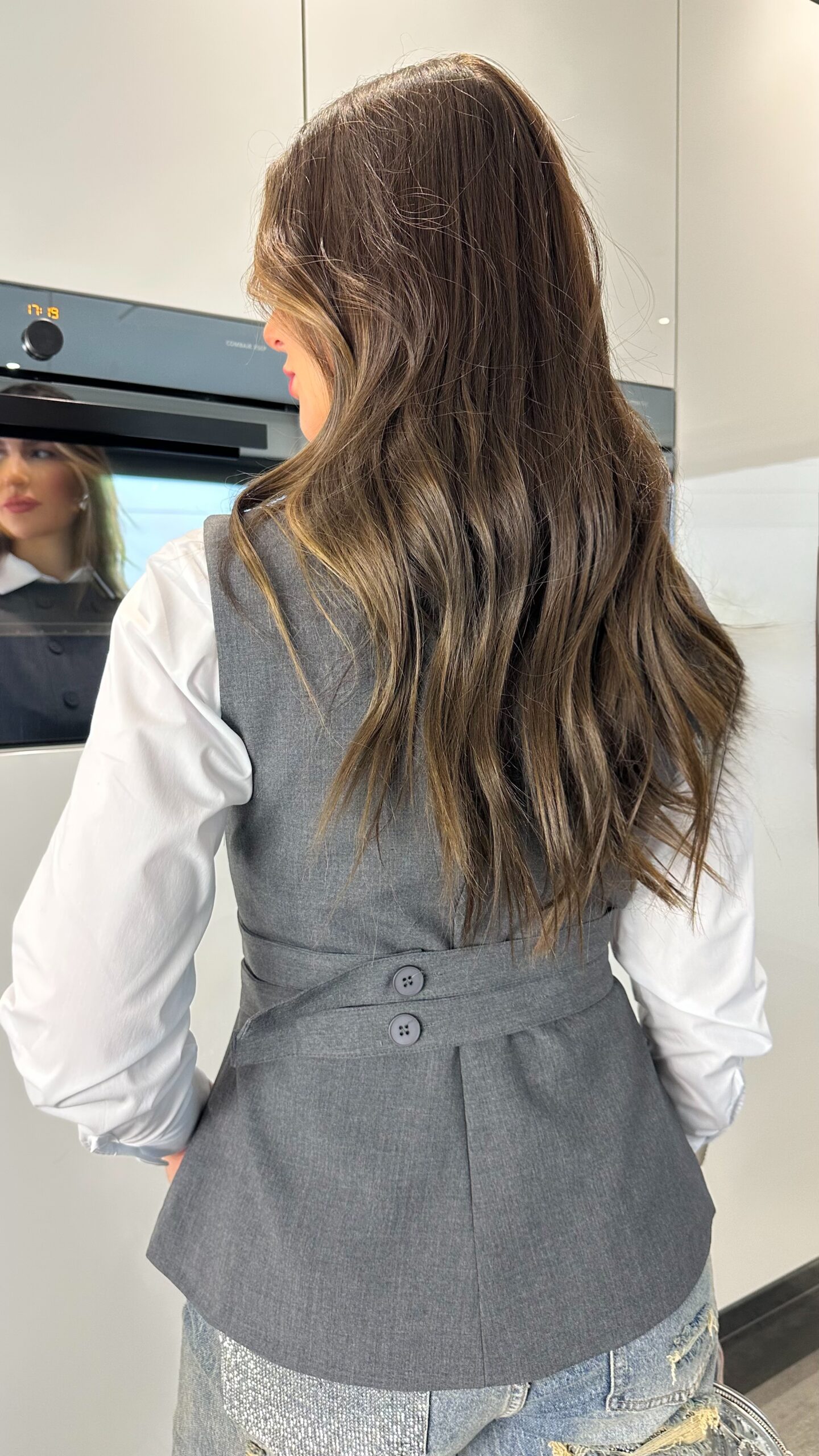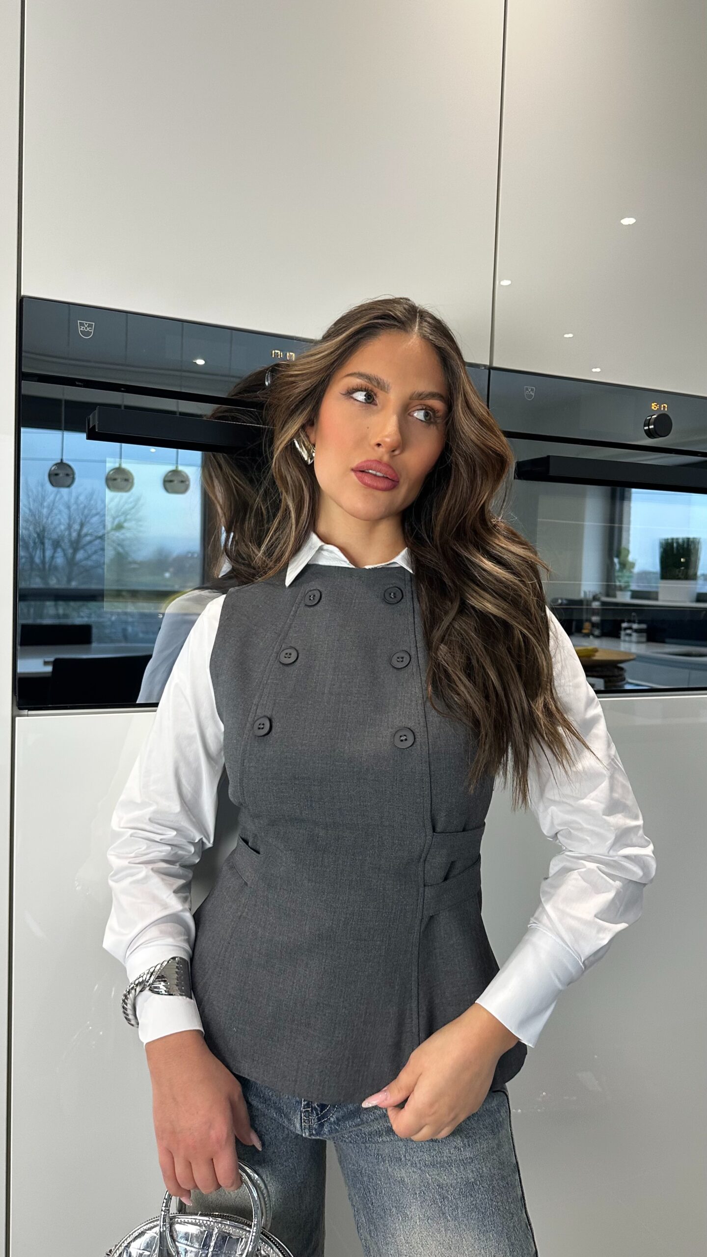 Gilet tailleur gris sans manches au style chic et structuré, pensé pour se porter par-dessus une chemise mais aussi facilement seul ou avec d’autres pièces. Il apporte immédiatement une allure habillée et élégante à la tenue tout en restant moderne. Les boutons sur le devant renforcent le côté tailleur et donnent beaucoup de caractère à la pièce, ainsi que ses deux lanières à l’arrière qui font toute la différence. La coupe est bien cintrée et structurée, ce qui met parfaitement la silhouette en valeur. Il se porte aussi bien avec un jean pour un look casual chic qu’avec un pantalon plus habillé pour une tenue sophistiquée. Une pièce forte, facile à associer, qui élève instantanément n’importe quelle tenue.