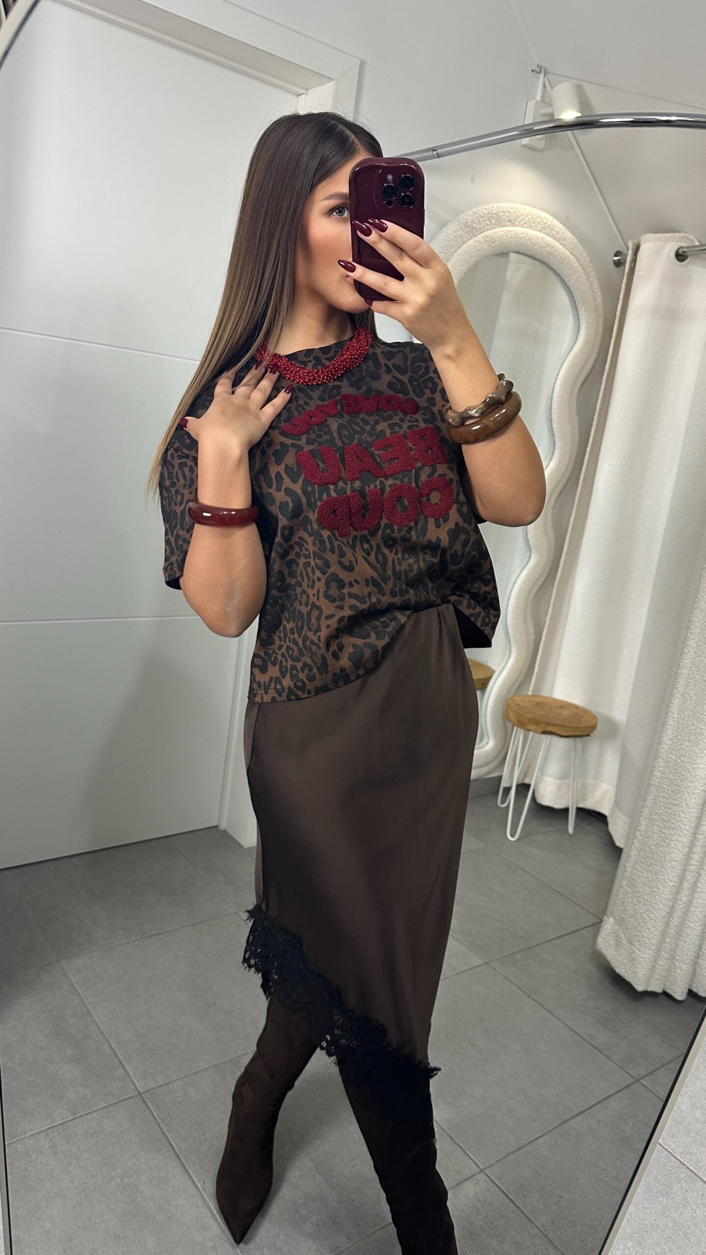 Coloris marron et noir avec écriture bordeaux, matière molletonnée légèrement épaisse, hyper tendance. À porter avec jupe, jean ou pantalon classique, ou superposé avec une blouse en voile ou dentelle manches longues.