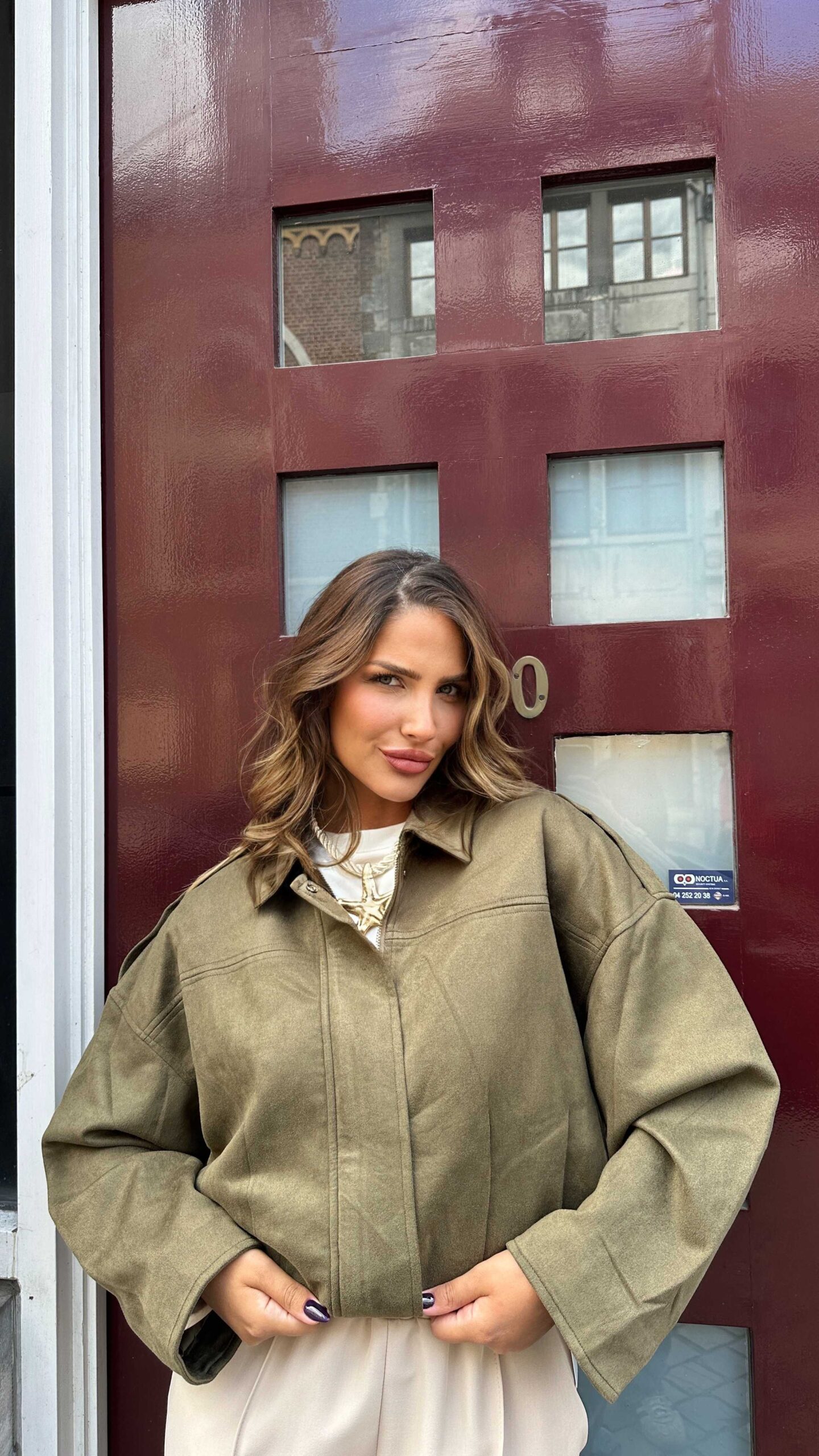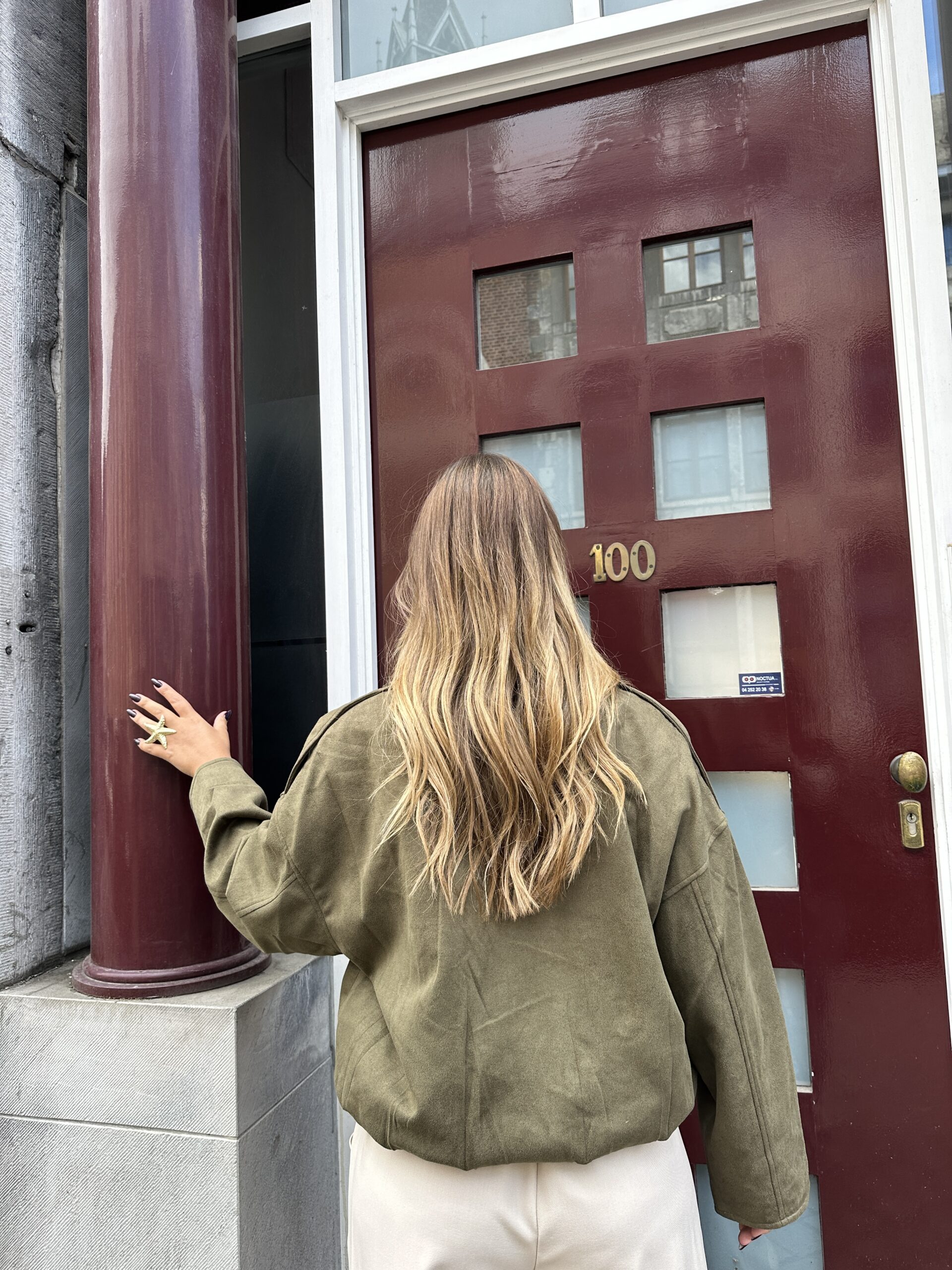 Veste en daim effet bomber, dans un kaki lumineux et tendance. Fermée et rentrée vers l’intérieur, elle adopte un style bomber marqué ; portée ouverte, elle devient plus classique. Polyvalente et facile à ajuster, elle se porte aussi bien en version chic que streetwear selon les accessoires choisis. Une pièce phare de la saison, avec le daim qui signe son grand retour.