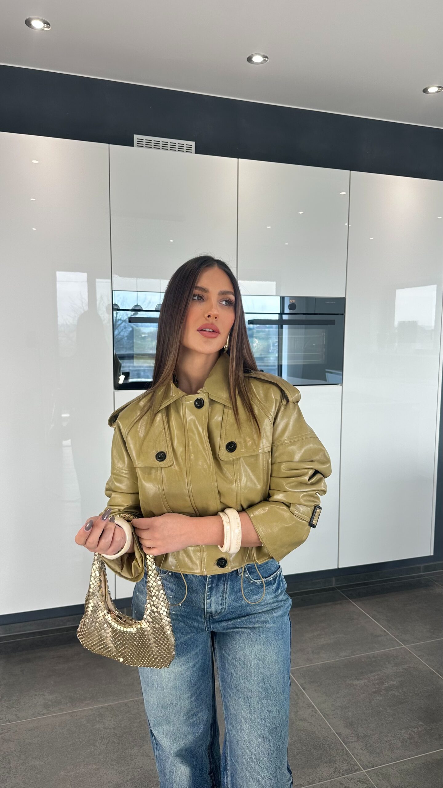 Veste style trench court vert olive à la coupe structurée et moderne. Détails inspirés du trench avec pattes aux épaules et poches à rabat. Taille ajustable qui souligne la silhouette grace aux élastiques. Matière effet cuir qui apporte du caractère à la tenue. A porter ouverte ou fermé.